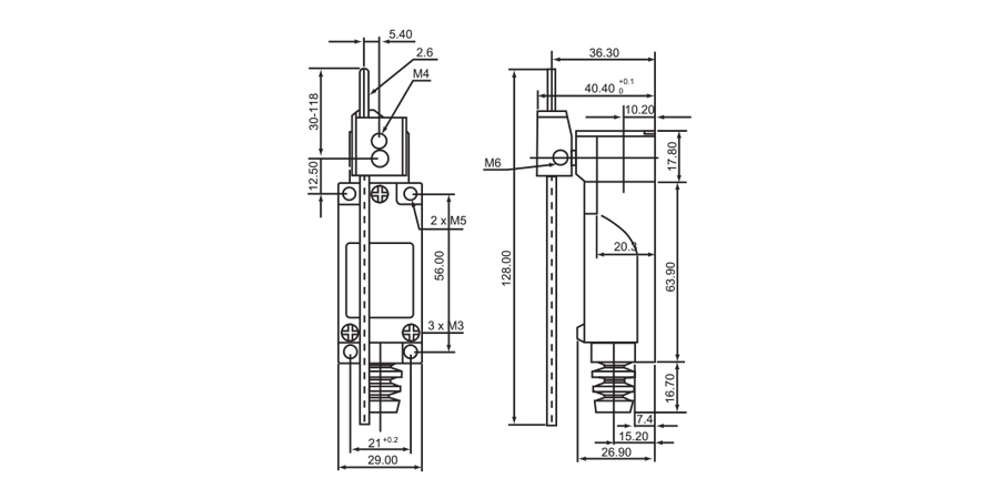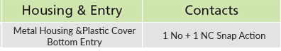 • Contacts: Snap Action 1 NO + 1 NC