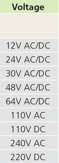 12 V AC/DC, 24 V AC/DC, 30 V AC/DC, 48 V AC/DC, 64 V AC/DC, 110 V AC, 110 V DC, 240 V AC, 220V DC |